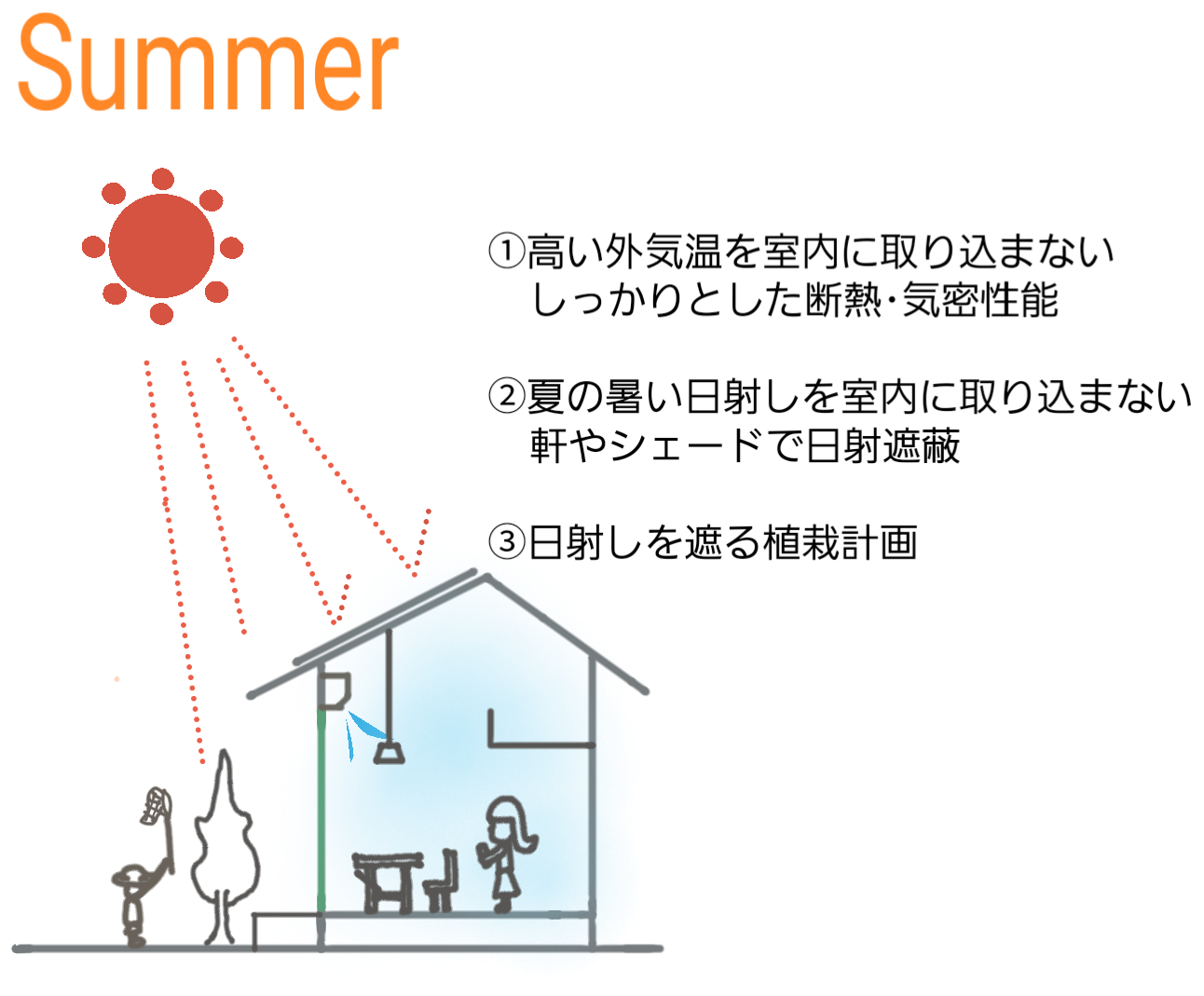 | 「夏は涼しく、冬暖かく、一年間を通じて安心した住まい環境」 が設計の基本であり 目指す住まいの姿だと思います。 年々過酷になる夏の気温と日差しを抑え、冬の温かい日差しは利用する。 パッシブデザインを積極的に設計に取り入れることで、冷暖房のエネルギーを削減します。 |