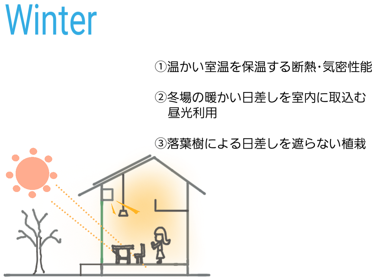 ※代表的なパッシブデザインの一例です。方角や配置も重要なパッシブデザインの要素です。
